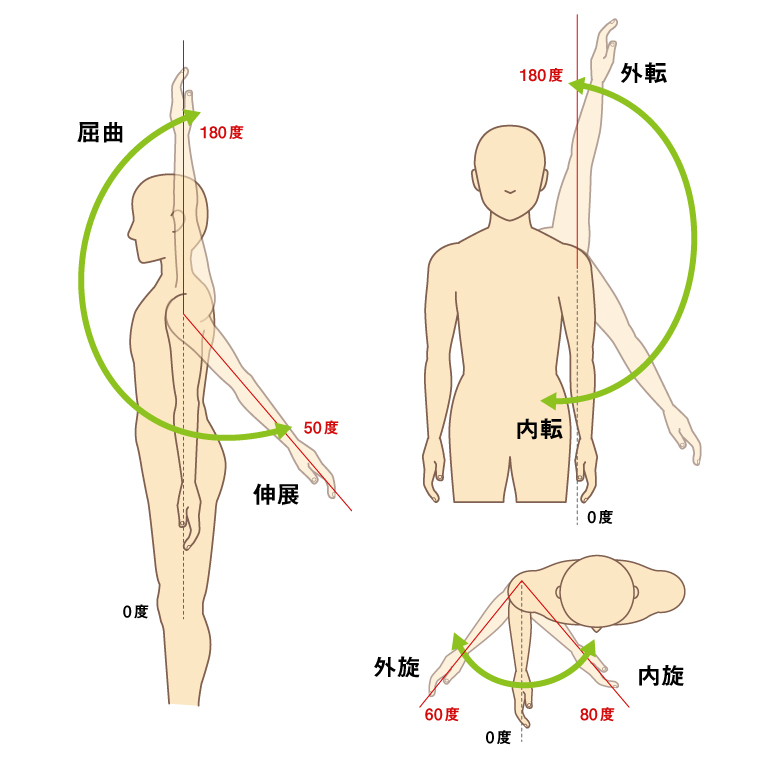 また四十肩になると、上の図の様な肩の可動域が出ないのも特徴です。