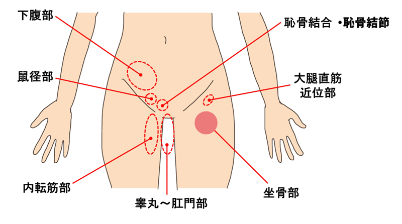 股関節を曲げる動きと足を踏み込んだ動きで鼠蹊部と睾丸部分に痛みが出ている。