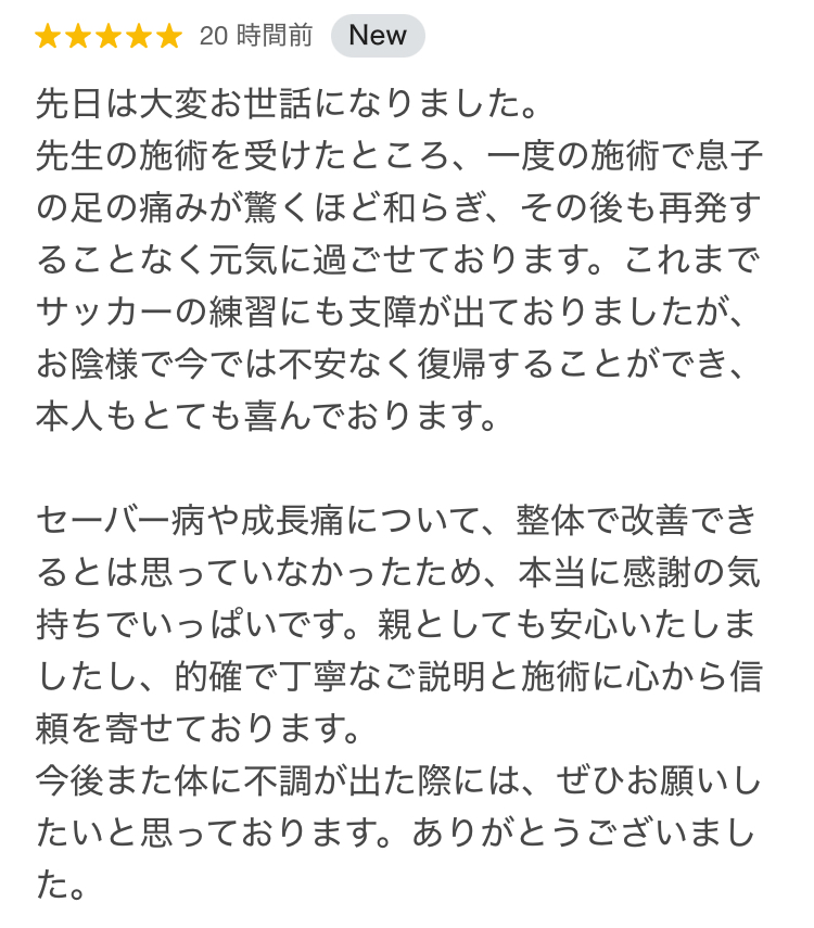 セーバー病や成長痛について、整体で改善できるとは思っていなかったため、本当に感謝の気持ちでいっぱいです。親としても安心いたしましたし、的確で丁寧なご説明と施術に心から信頼を寄せております。