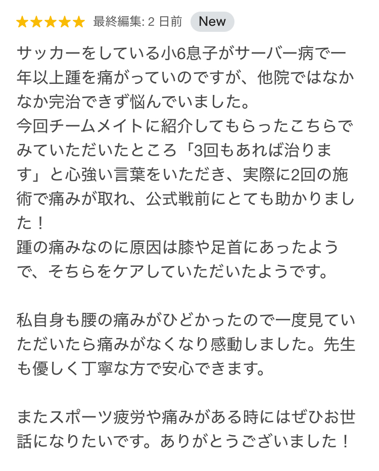 サッカーをしている小6息子がシーバー病で一年以上踵を痛がっていたのですが、他院ではなかなか完治出来ず悩んでいました。
